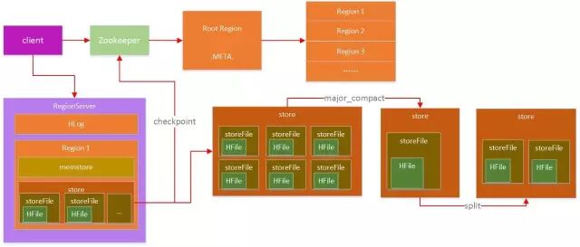 HBase通过ZK —> -ROOT- —> .META.的访问获取RS地址后,直接向该RS上进行数据写入操作,整个过程如下图: