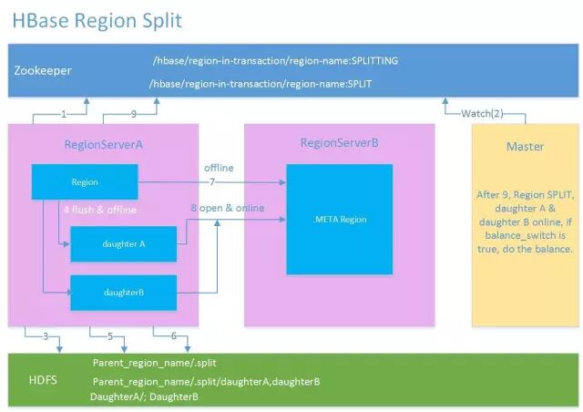上面1 ~ 9就是region split的整个过程,split过程非常快,速度基本会在秒级内,那么在这么快的时间内,region中的数据怎么被重新组织的?