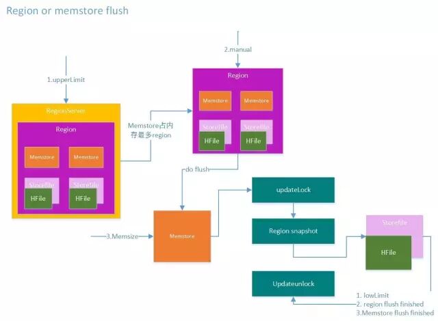 memstore在不同的条件下会触发数据刷盘,那么整个数据在刷盘过程中,对region的数据写入等有什么影响?memstore的数据刷盘,对region的直接影响就是:在数据刷盘开始到结束这段时间内,该region上的访问都是被拒绝的,这里主要是因为在数据刷盘结束时,RS会对改region做一个snapshot,同时HLog做一个checkpoint操作,通知ZK哪些HLog可以被移到.oldlogs下。从前面图上也可以看到,在memstore写盘开始,相应region会被加上UpdateLock锁,写盘结束后该锁被释放。